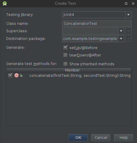 Ahora crearemos nuestra clase de test haciendo click sobre la clase que acabamos de escribir y pulsando ctrl+shift+t o haciendo click derecho sobre el editor de texto y seleccionando Go To > Test > Create New Test…, esto nos permitirá crear una nueva clase de test para Concatenator. En esta clase de test escribiremos un test que pruebe la funcionalidad del método concatenate() .